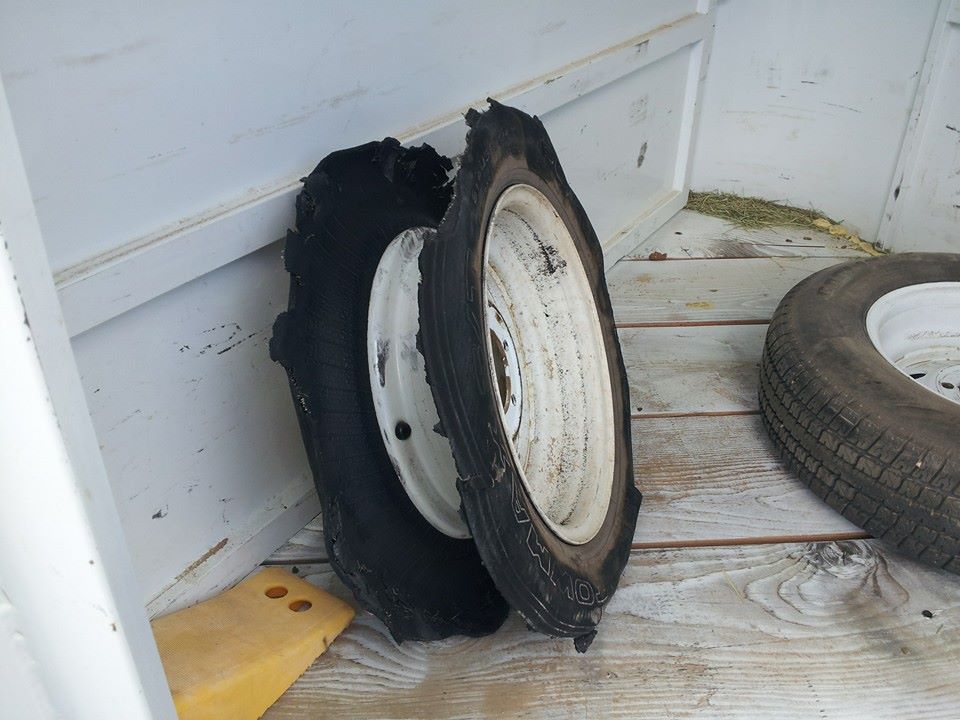 I was probably going 50 or 55 at the time because it was so windy up there. The sign had said “use caution.” I was using caution. Then I felt this little tug on the truck. Nothing big—could have been a gust of wind. But the little voice was saying “that didn’t feel right,” and I had to agree. I glanced in the side view mirror and saw something in the lane behind me. I couldn’t believe I had run over something without even seeing it, so I pulled over right away. That’s when I saw the shredded tire on the horse trailer. I hadn’t run over something—the thing in the lane was the tread of the tire that had been ripped off the wheel. The sidewalls were still hanging on the rim. Ugh!